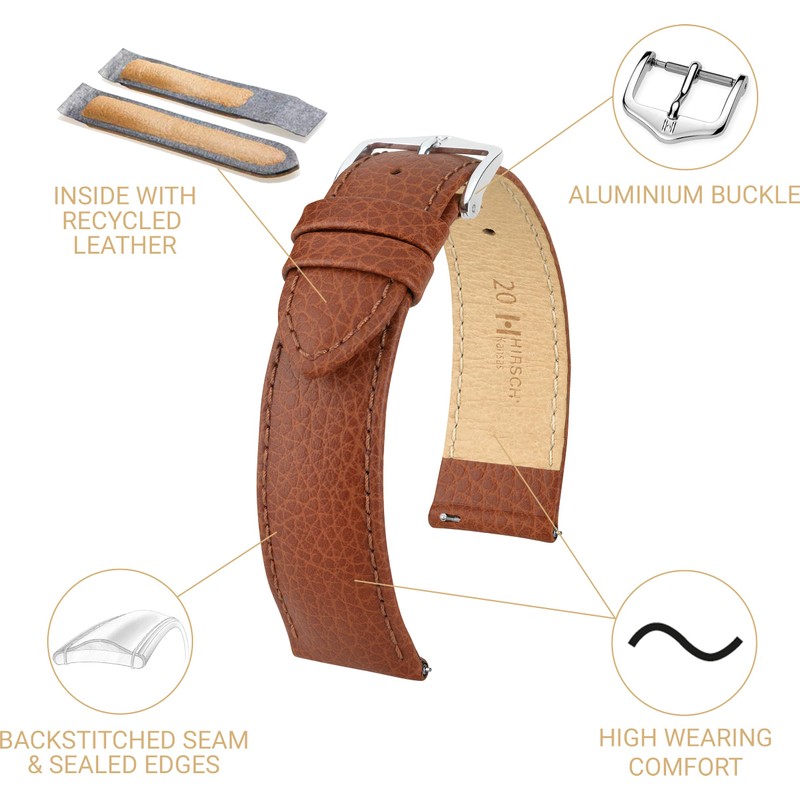 HIRSCH Kansas Watch Strap - Durable Calf Leather Buffalo Embossed Watch Strap - 12 to 24 mm, Golden Brown, 18 mm, Classic