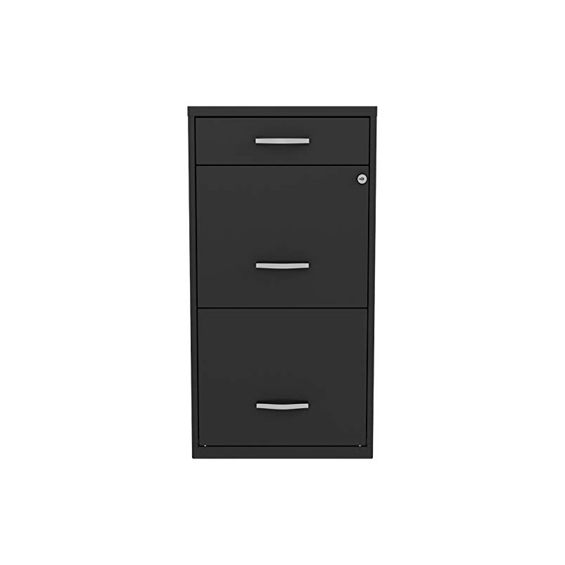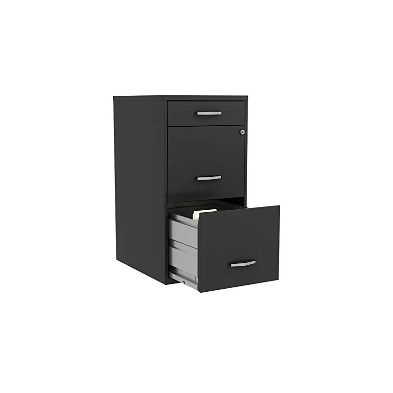 The Three Drawer Metal File Cabinet in black is the ideal storage solution for any small office or home office. Featuring two file drawers and an additional small storage drawer, this file cabinet is the perfect solution for your home office needs. This file cabinet features a smart, efficient design that works well in smaller spaces, and fits under most work surfaces or desks. Each drawer features high-sides to accommodate letter sized hanging files. The top pencil drawer can also be perfect storage for other office essentials. Using a patented glide suspension, the drawers have a smooth open and close slide with a three-quarter drawer extension. In addition, you can keep your files and possessions secure by using the built-in lock for both drawers. Painted steel surface is non-porous and easy to clean and disinfect. Bring organization and function to your home or office with this three-drawer file cabinet!