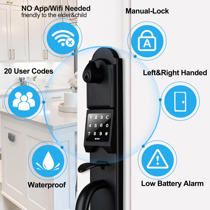 • 【Make Your Life Easier】Unlock with touchscreen passwords(or emergency keys)&manual thumb turn button from outside. Up to 20 user codes, suitable for harsh environment, NO App/Wifi, low battery alert, manual locking