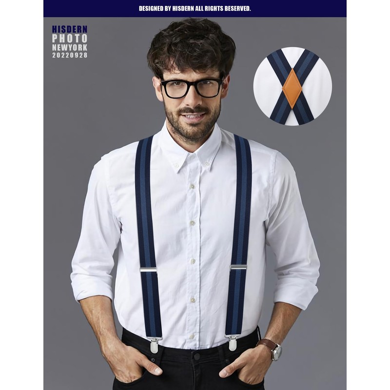 HISDERN Men's 3.5 cm Wide X-shaped Braces with Very Strong 4 Metal Clips for Men and Women Elastic and Adjustable, Blue stripes
