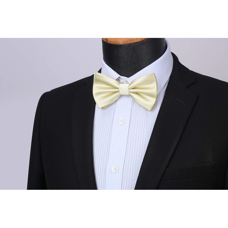 - CHAMPAGNE MEN: bow tie length 4.72 inches and width 2.75 inches. The bow tie strap length can be extended from 9.8 inches to 20.47 inches. Pocket square size: 12 inches x 12 inches. Package includes: bow tie with handkerchief set and simple gift box