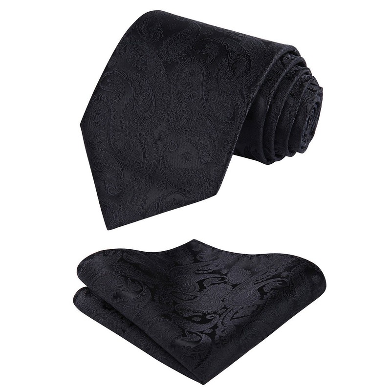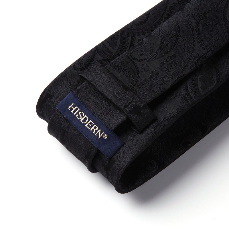 HISDERN Men's Wedding Ties and Pocket Square, Paisley Tie Set, Plain, in Various Colours, Black (black-5)