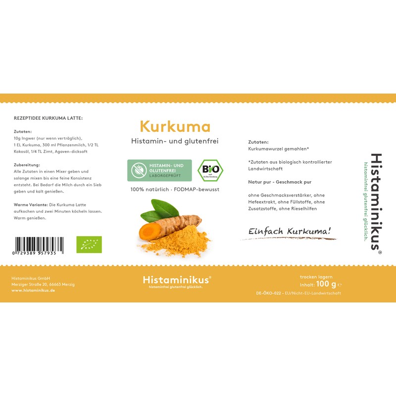 Histaminikus Kurkuma, Bio Kurkuma-Pulver (100g), hefefreies Naturprodukt ohne Geschmacksverstärker, histaminarm, glutenfrei, fodmap-bewusst, vegan und geeignet bei Histaminintoleranz