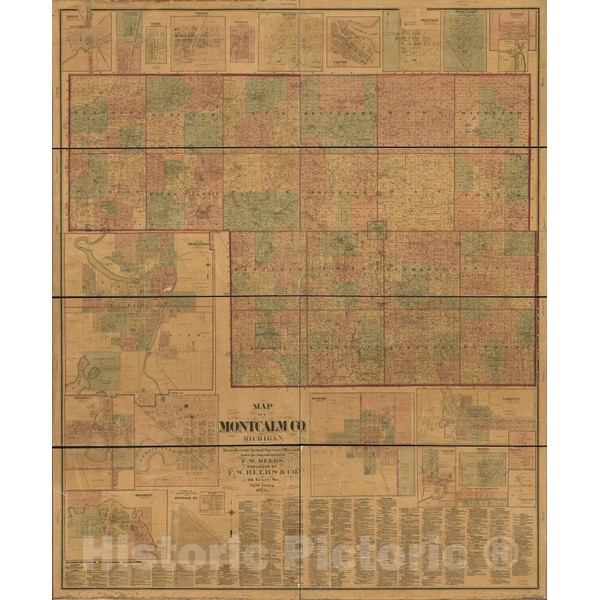Historic 1875 Wall Map - Topographic map of Montcalm Co, Michigan 24in x 30in