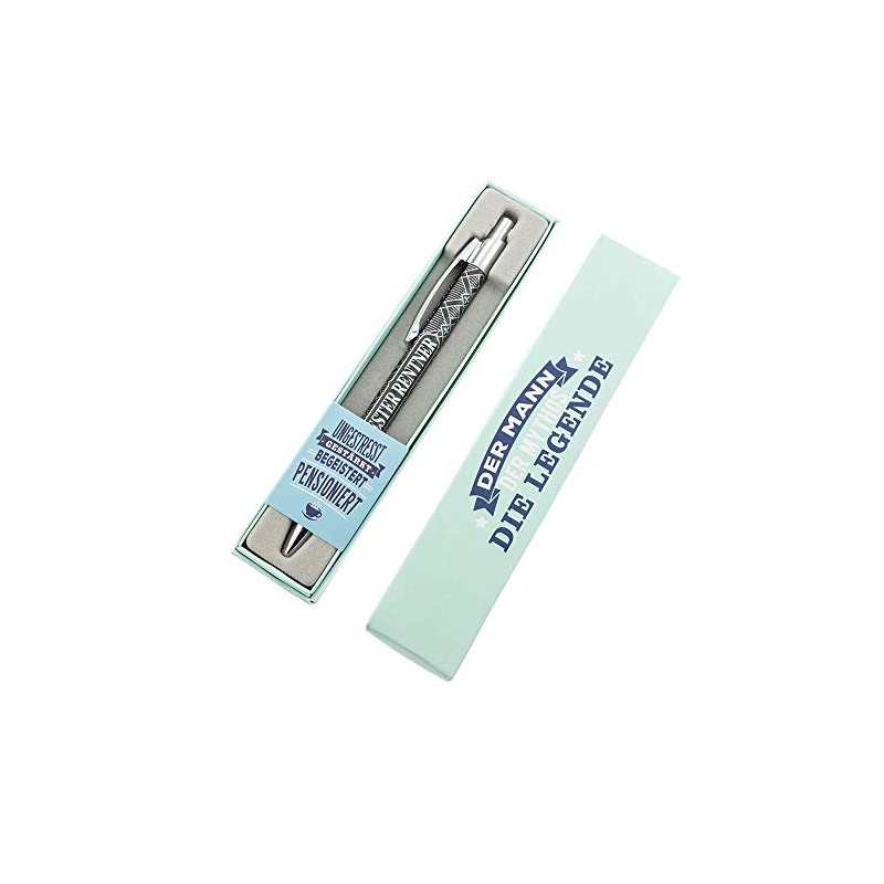 - ✎Design: The stylish retractable ballpoint pen has a high-quality engraving and sits very well in the hand. The ballpoint pen is packed in a lovingly designed colourful gift box. This pen has the saying "Echter Kerl Top Kuli: "Bester Rentner - Der Mann, Der Mythos, Die Leggende".