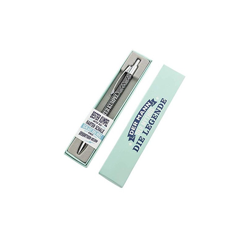- ✎Design: The stylish retractable ballpoint pen has a high-quality engraving and sits very well in the hand. The ballpoint pen is packed in a lovingly designed colourful gift box. This pen is with the saying "Echter Kerl Top Kuli: "Bester Kumpel - Der Mann, Der Mythos, Die Leggende".