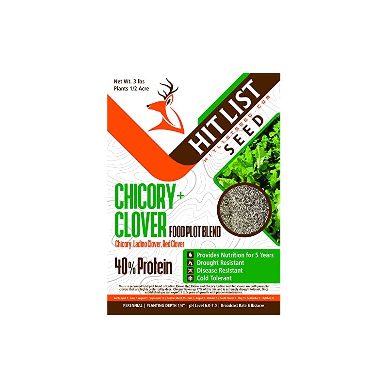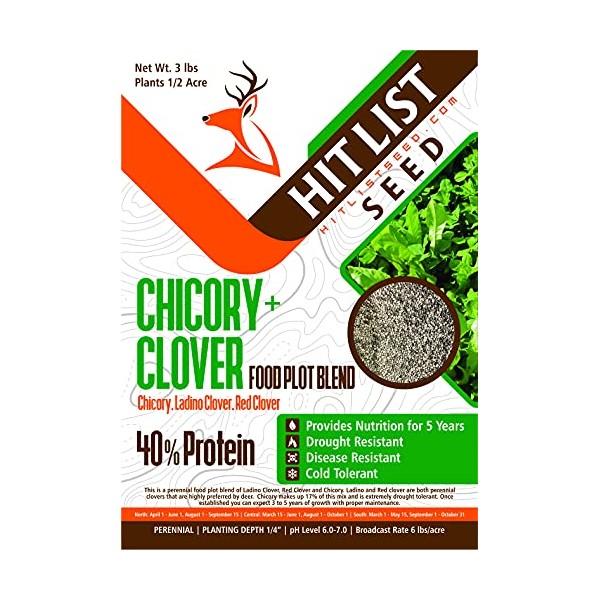 Hit List Seed Chicory + Clover Perennial Deer Food Plot Blend, 3 lbs (1/2 Acre) - Chicory, Ladino Clover, Red Clover, Whitetail, Blacktail, Deer, for Hunting Plot, Pure, Natural, High in Protein