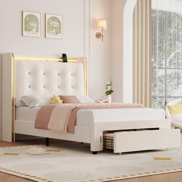HITHOS Upholstered Twin Led Bed Frame with Charging Station and Storage Drawer, Velvet Princess Platform Bed Frames with Crystal-Button Tufted Headboard for Girls | Kids, No Box Spring Need, Beige