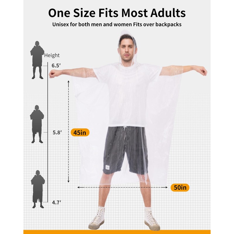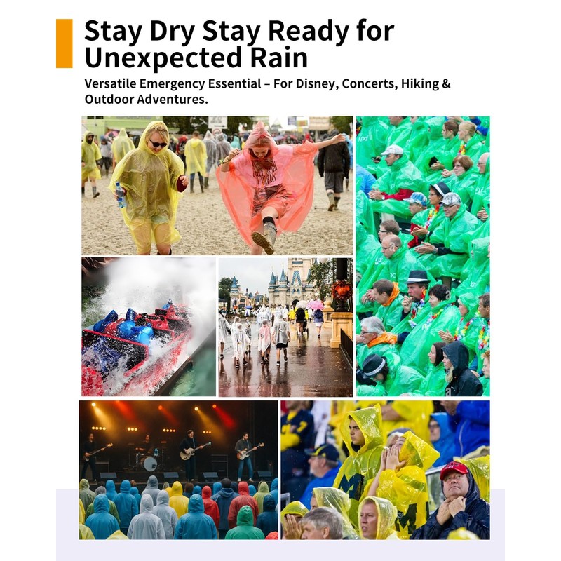 - Be Ready for the Unexpected – Whether you're heading to concerts, theme parks, camping trips, or sports games, our disposable rain ponchos for adults and kids keep you dry when the weather changes fast. Each pack includes individually wrapped ponchos for easy grab-and-go convenience