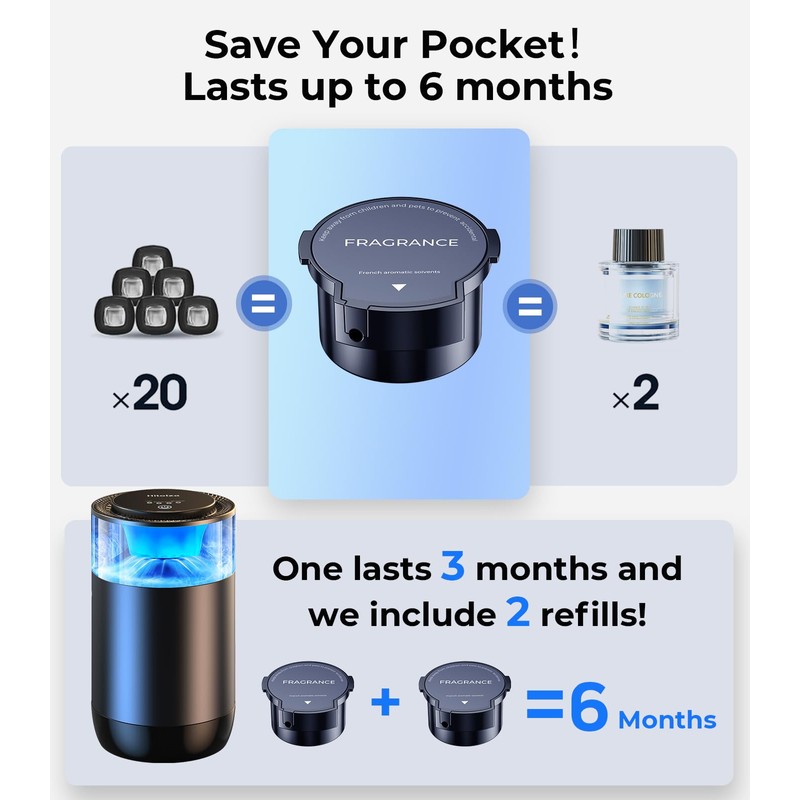 - [Long Lasting]: Enjoy a long-lasting fragrance that keeps your car fresh for months, providing great value for your investment. Comes with two essential oil refills. The built-in counter allows for 1200 sprays per refill. If you drive 10 hours per week, refilling twice will last approximately 6 months