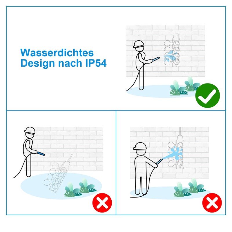 - 4 in 1 outdoor socket: protection class: IP54 (splash-proof), heat and cold resistant, maximum load 3500 W, 250 V/16 A max. Kink protection + child safety splash guard, double connection for wet rooms.