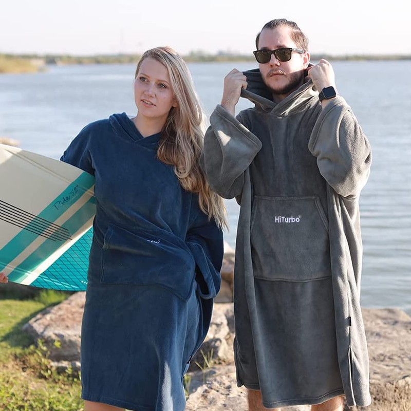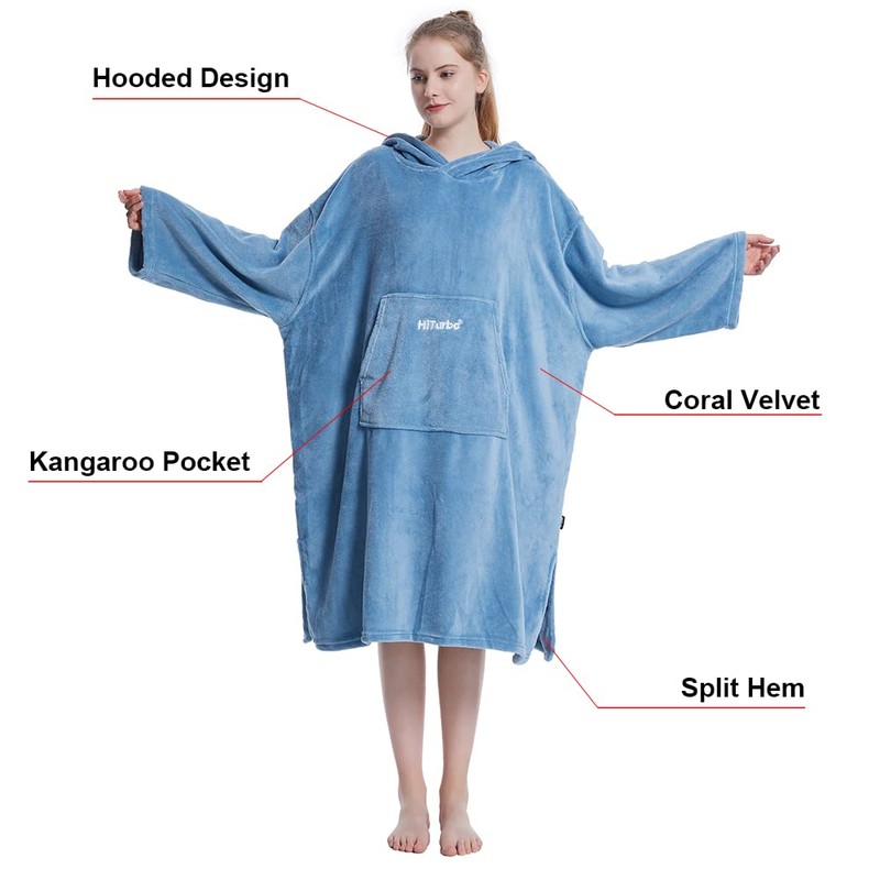 Hiturbo Plush Changing Robe, Fluffy Wearable Blanket, Soft Oversize Hooded Towel Surf Poncho with Pocket for Aquatics & Home (Blue)
