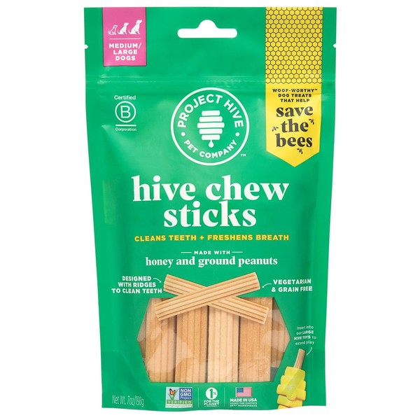 Hive Treats for Dogs — Healthy, Non-GMO Project Verified, Natural Peanut Butter Flavored, Natural, Vegetarian Chews, Made in The USA (Chew Sticks, Large Breeds)