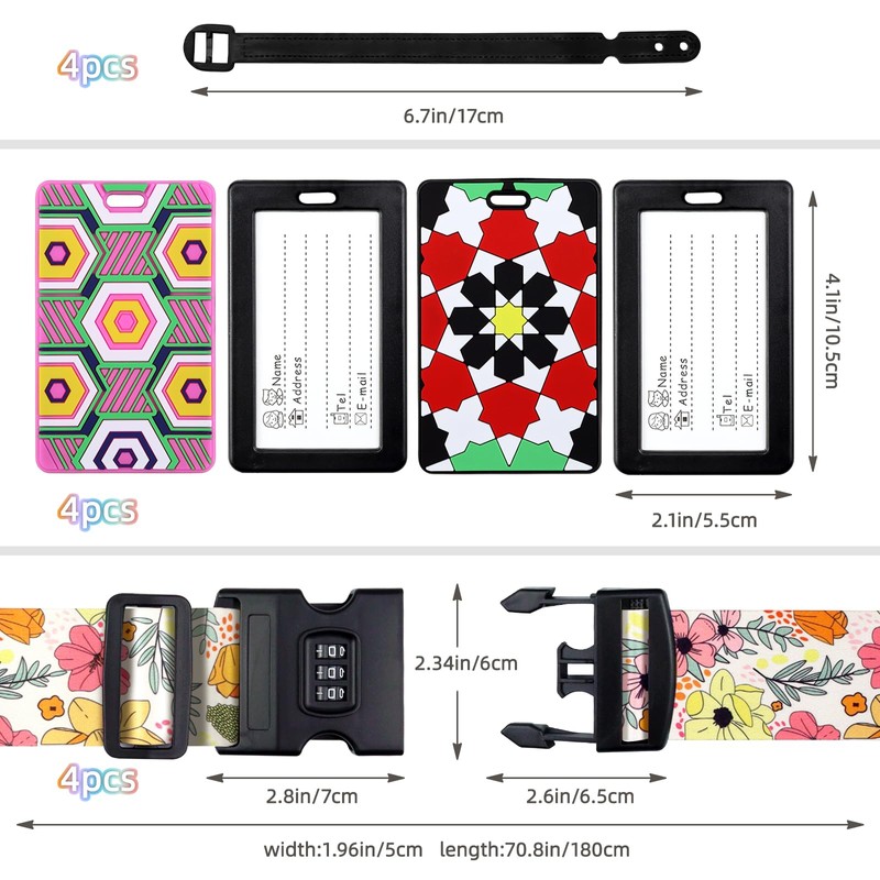 - A set of luggage strap and luggage tag is the perfect travel gift for family, friends or yourself. If you are afraid of others taking the wrong suitcase, then each of the many patterns is absolutely eye-catching and the fashionable accessory of your luggage. Travel accessories can bring joy and comfort to your trip. If you have any questions about the purchase, you can also contact us by email.