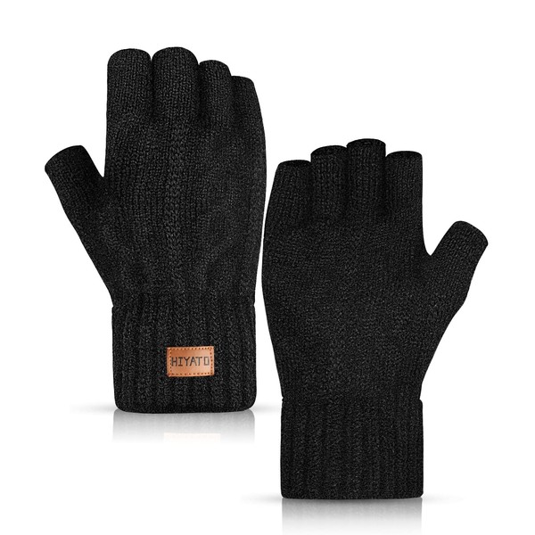 HIYATO Mens Fingerless Gloves,Winter Warm Knit Gloves with Soft Lining,Touchscreen Thermal Gloves for Men and Women (Black Fingerless 02)