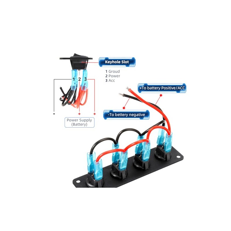 - Easy to Use: Connect the copper pins of marne switch panel to the negative pole of the battery, the next pin is connected to the positive pole of the battery, and the last pin is connected to the positive pole of the device, our 12v switch panel equipped with a keyhole slot to prevent unnecessary rotation.