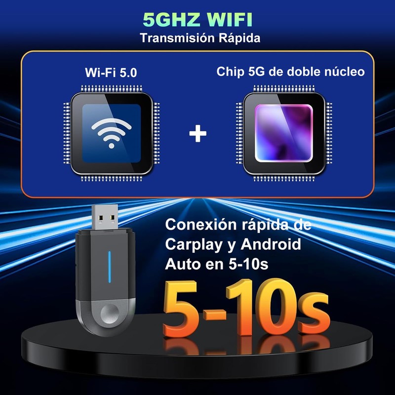 - 【WIFI de 5 GHz, Transmisión Rápida】 Nuestro adaptador CarPlay cuenta con un exclusivo sistema de firmware integrado la tecnología WiFi de 5GHz garantiza una transmisión de datos rápida y estable, y un chip 5G integrado mejora la recepción para una experiencia de navegación sin interrupciones. Disfrute de una navegación fluida, llamadas manos libres y transmisión de música con su rápida velocidad de procesamiento, haciendo que cada conducción sea cómoda y agradable. (por favor, asegúrese de que el Bluetooth y wifi de su teléfono están encendidos antes de conectar)