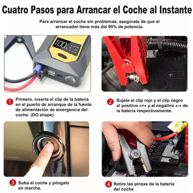 - 【Tecnología de seguridad mejorada】Nuestro arrancador de coche con cables de puente de seguridad utiliza múltiples medidas de seguridad, Incluye cortocircuito, sobrecarga, sobrecorriente, sobrecarga, sobredescarga, sobrecalentamiento y sobretensión, prioriza la seguridad integral para usted y su vehículo. Solo se requieren cuatro pasos para conectar y encender de forma segura la batería de su automóvil de 12 V.
