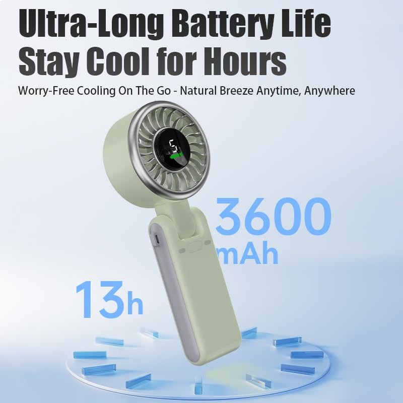 - 180° Foldable Design with LED Display: This handheld fan foldable features a smart LED display to monitor battery life and speed settings. The 180° adjustable design works as a small desk fan, neck fan, or handheld cooler. Perfect travel fan portable with visible power indicators for worry-free use anywhere.
