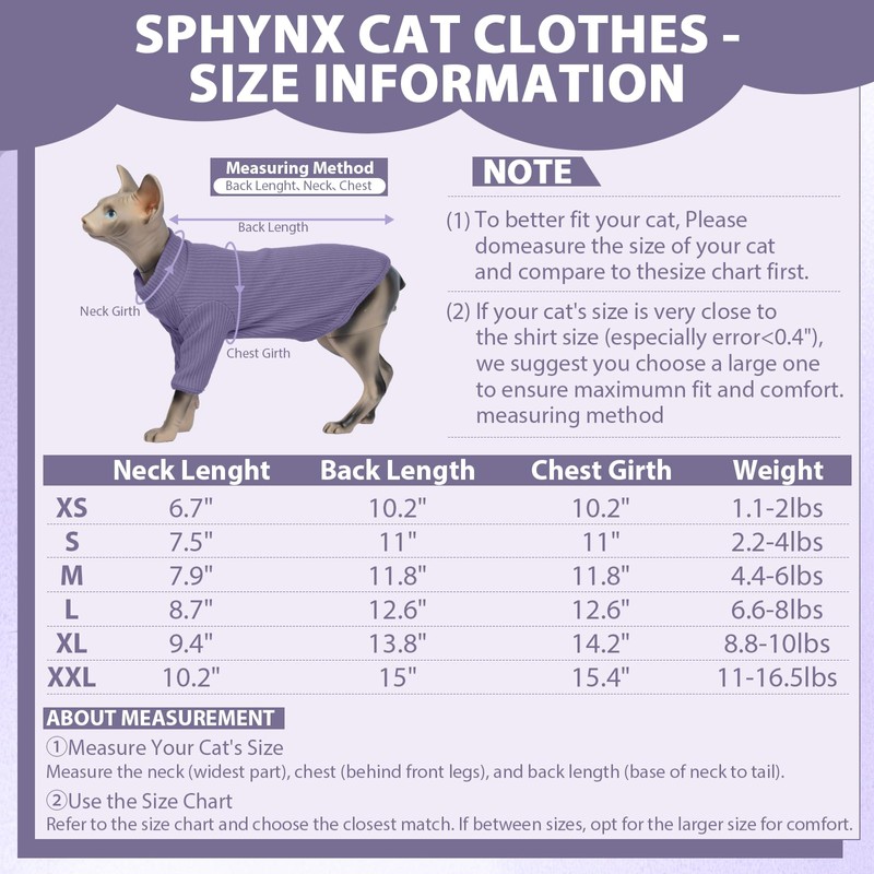 - 【SIZE INFORMATION】Attention: All these size suggestions are for Hairless Cat Only. Size XS for weight under 1.1-2lb. Size S for weight between 2.2-4lbs. Size M for 4.4-6lbs. Size L for 6.6-8lbs. Size XL for 8.8-10lbs, Size XXL for 11-16.5lbs. If Your cats are NOT hairless but like our cat clothes/cat sweater/kitten clothes/kitten pajamas, Please order one size Larger. More Size information please refer to the size chart below