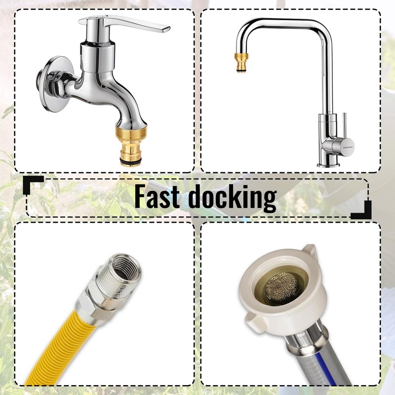 • Wide Application This faucet hose connector is suitable for most sizes of faucets, garden hoses, irrigation equipment, car washes, pressure washers, drip irrigation systems, water pipes, lawn sprinklers, washing machines, etc. It can help solve water supply problems in different scenarios such as bathrooms, kitchens, patios, etc.