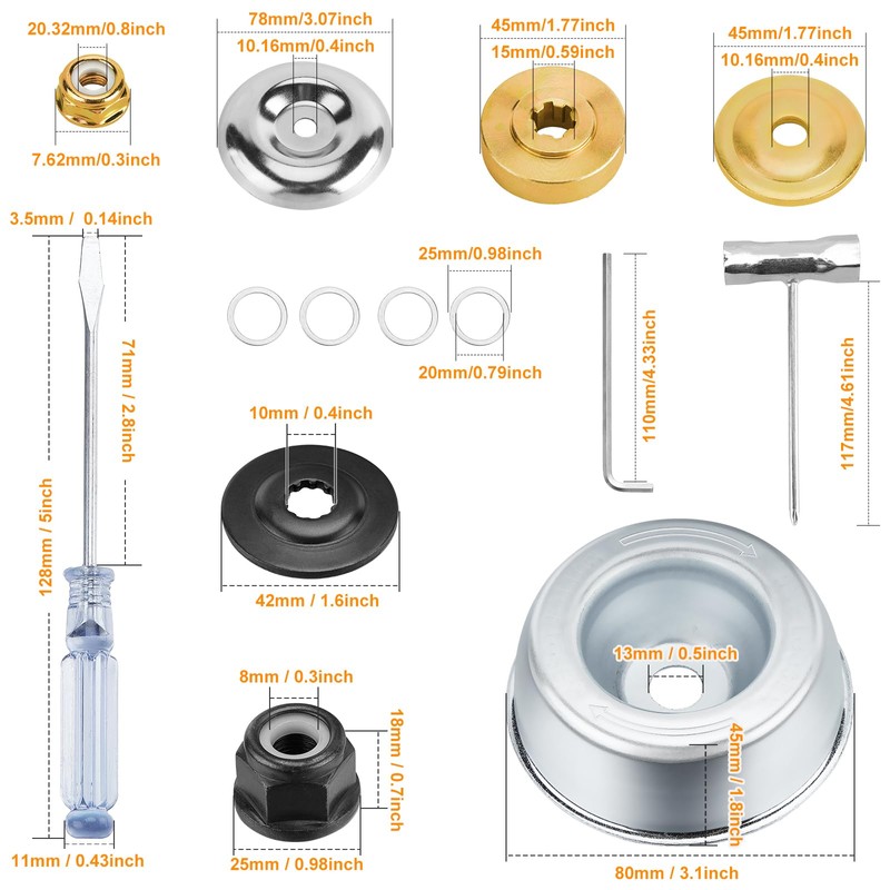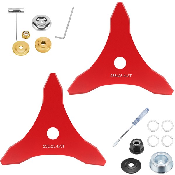- 【Package Included 】Carbide blade adapter kit contains two sets of 16 pieces that help to mount to the weed eater, 2 x 10" 3 Teeth Carbide Tipped Blades, Blade Adapter Attachment Kit: 1 x Thrust Washer(10 teeth)/ 1 x Rider Plate/ 1 x Collar Nut(m10x1.0, 0.315inch inside diameter)/ 1 x Screwdriver/2 x attached washers. Blade Adapter Kit: 1 x Thrust plate guard washer (6 teeth)/ 1 x Thrust washer/ 1 x Rider plate/ 1 x Lock nut(m10x1.25, 0.3inch inside diameter)/2 x attached washers.