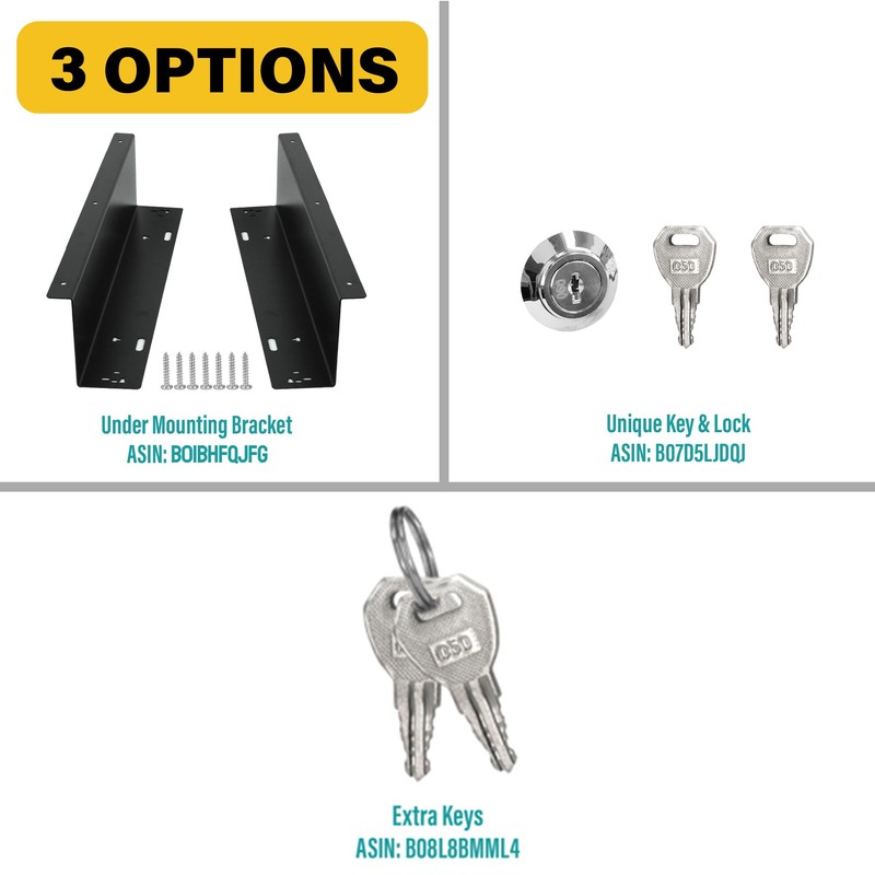 - Extra Keys (ASIN B01HN1QB7E), Till Cover Available (ASIN B01BG6ESZO), and Under Counter Mounting Metal Bracket (ASIN B01BHFQJFG) if needed