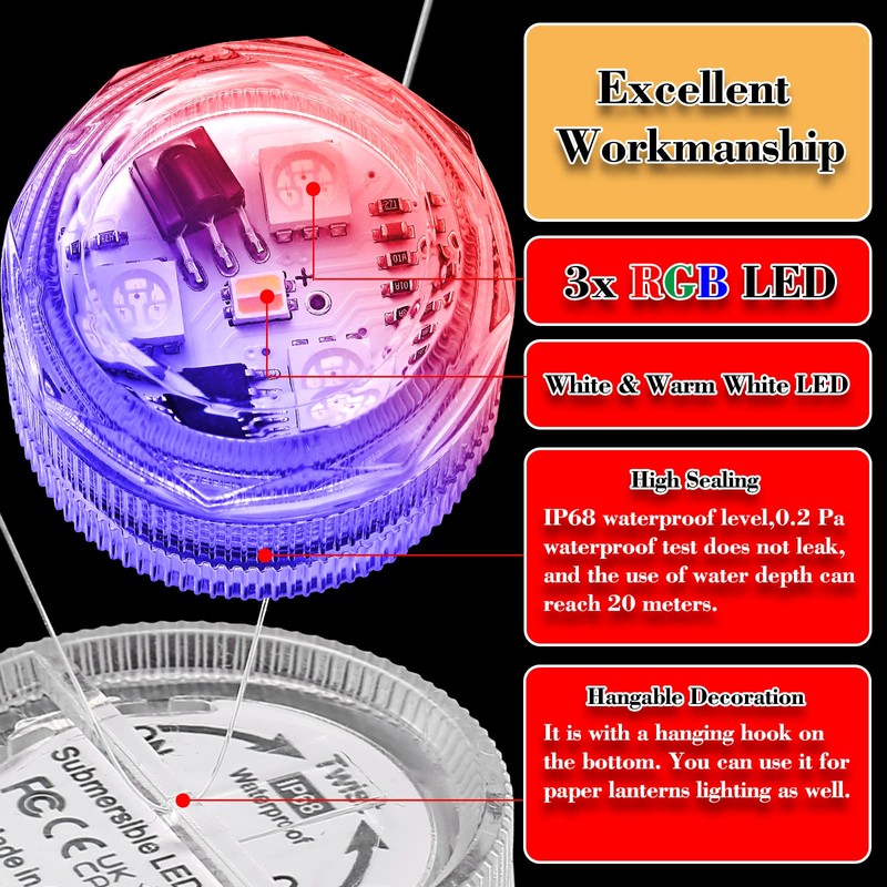 - Breite Anwendung: Ideal fr Tafelaufs?tze, Vasen, Teiche, Schwimmb?der, Aquarien, Eiskbel und so weiter. Definitiv stimmungsvolle Lichter auf Hochzeiten, Partys, Valentinstag und anderen Veranstaltungen. Mit einem Haken zum Aufh?ngen an der Unterseite k?nnen Sie es auch fr Laternenbeleuchtung verwenden.