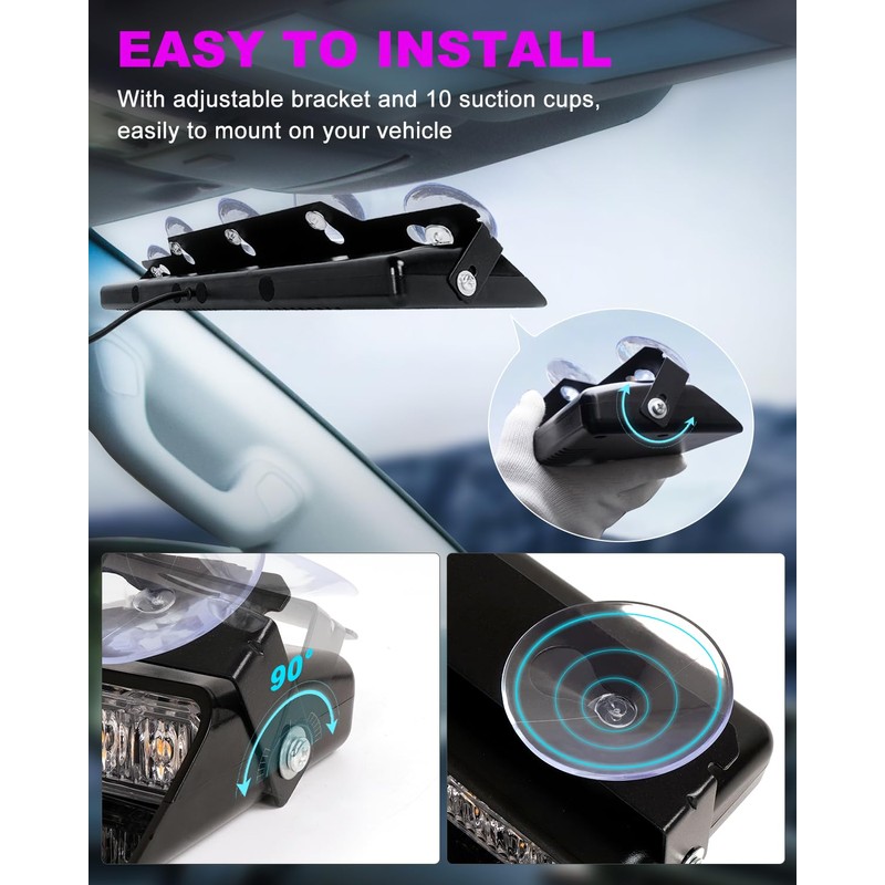 - EASY TO INSTALL: With adjustable brackets, 10 suction cups, and 13.12ft long cable, you can easily place these dash strobe lights on the window and install them on the front windshield or rear window