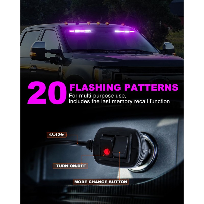 - QUICKLY RESPONDER: Just plug in the 12V or 24V cigarette lighter, and choose the strobe mode you need. This visor light bar has 20 flashing modes with last memory recall. Great for security, construction safety warnings, police, and law enforcement vehicles, etc.