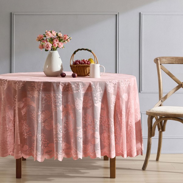 HLC.ME Butterfly Floral Lace Fabric Tablecloth, Lace Fabric Table Cloth for Round Tables, Wrinkle Resistant Tablecloth, Patterned Scalloped Tablecloth (70 Round, Blush Pink)