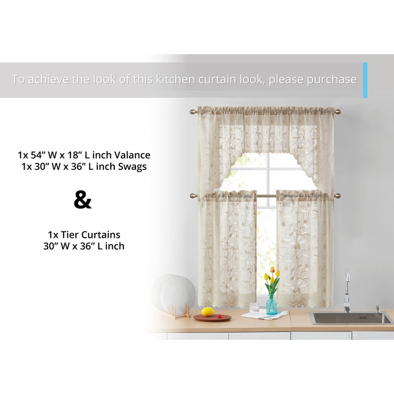 - To complete a full kitchen curtain set as shown in our photos, you will need to purchase one (1) tier set according to your window size + one (1) swag set + one (1) tier measuring 18" inch long. Please note swags and tiers are sold separately.