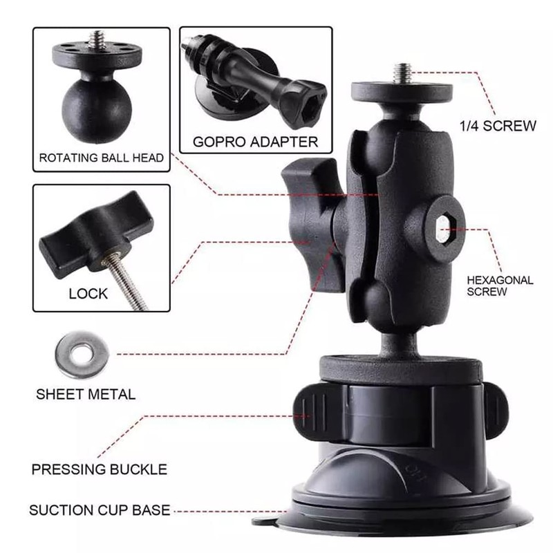 - 〖 Standard 1/4” Thread Ball Head Adapter 〗 - Suction cup mount bracket come with universal 1/4" screw thread and adapter for GoPro, is compatible with most action cameras, you can attach anything with a female end with 1/4” threads