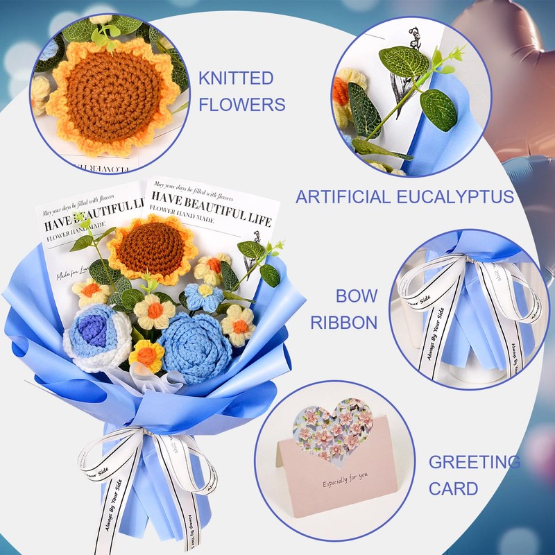 Hlenbin Crochet Flowers Bouquet, Crochet Sunflower Rose Bouquet for Mother's Day, Father's Day, Graduation, Anniversary, Birthday, Gifts for Mom, Dad, Friends, Teachers, Blue