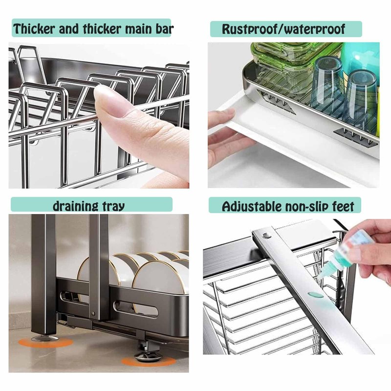 - DURABLE CONSTRUCTION: Kitchen rack for dishes Made from high-quality stainless steel that and whole thicken stainless steel frames,stable and durability.resists rust and corrosion, ensuring long-lasting performance in wet conditions