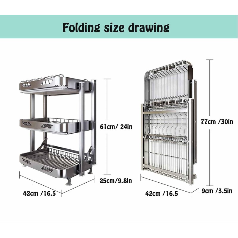 HLHHDFC Foldable Dish Rack,Stainless Steel Drain Rack,3 Tier Dish Drying Rack, Rustproof Dish Drainer for Kitchen Countertop with Drain Tray,Silver