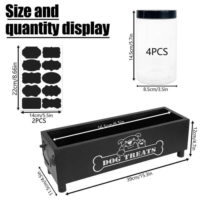 - Super Capacity Treats Storage Container: Our dog food storage container measures 15.3 inches (L) x 4.5 inches (W) x 4.7 inches (H), which is equipped with 4 high capacity food plastic jars and 20 blank labels, enough number of food plastic jars can satisfy your daily needs, and the blank labels can be well categorized to store a variety of pet-friendly snacks, such as dog food, cat food, snacks or cookies.