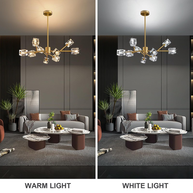 - No Glare living room chandeliers modern design lighting with brushed gold metal lamp body, and organic crystal cover,enough bright for working,watching tv, reading,cooking and having breakfast
