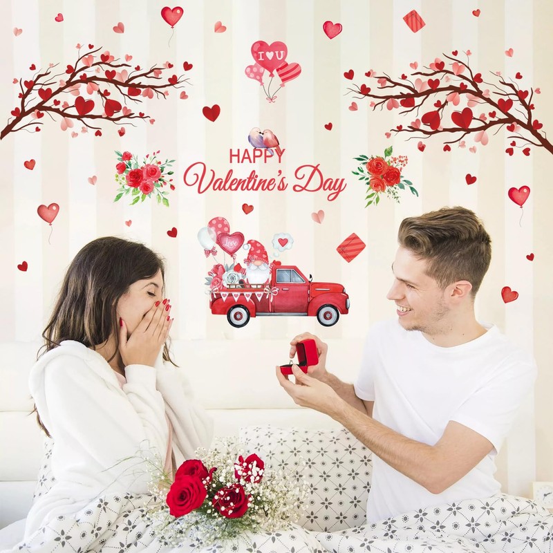 - Romantic and Festive Design: Celebrate Valentine's Day with our vibrant and romantic wall decals featuring a heart-filled tree, adorable pink gnomes, and charming vintage red truck, perfect for spreading love and joy.