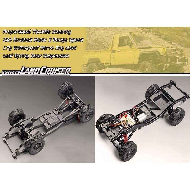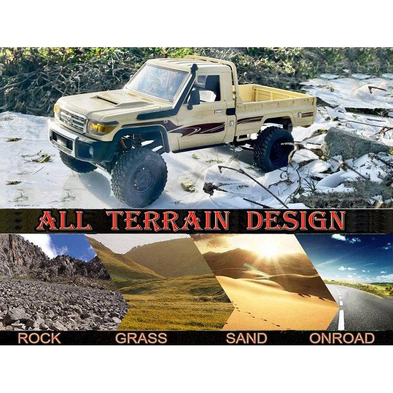 - 【Conquer Various Terrains】The 280 brushed motor 4-wheel drive provides powerful strength that allows the RC truck 4x4 to climb rocky and uneven surfaces. With high-quality rubber tires, the crawler's strong grip forces it to drive on various terrains such as beaches, sand, mountains, grass, roads, muddy patches, rocky trail paths, or rugged roads. The Landcruiser RC truck can move a long distance and satisfy your wish.