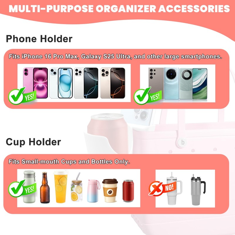 - 【2-in-1 Phone & Cup Holder Design】 Holds your phone upright and keeps your drink steady – perfect for beach days, games, or everyday use with your Bogg Bag.Please note: this holder is not designed to fit Stanley 40 oz cups. It works best with small water bottles, juice, or slim drinks.