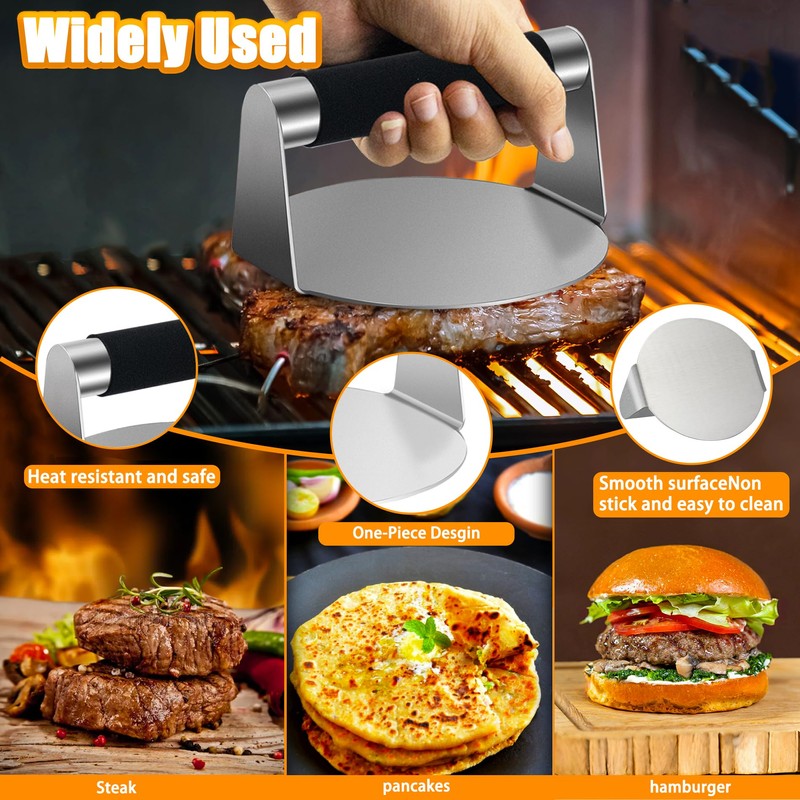 - Widely Used: The burger press kit allows you to cook meat more quickly, very suitable for burgers, bacon, sausages, ham, hash browns, grilled sandwiches, and quesadillas. It is suitable for outdoor flat-top grills, griddles, and skillets, making it an excellent choice for holiday barbecues, strovetop grilling, and home kitchen cooking. It's a great gift for burger and grill enthusiasts.