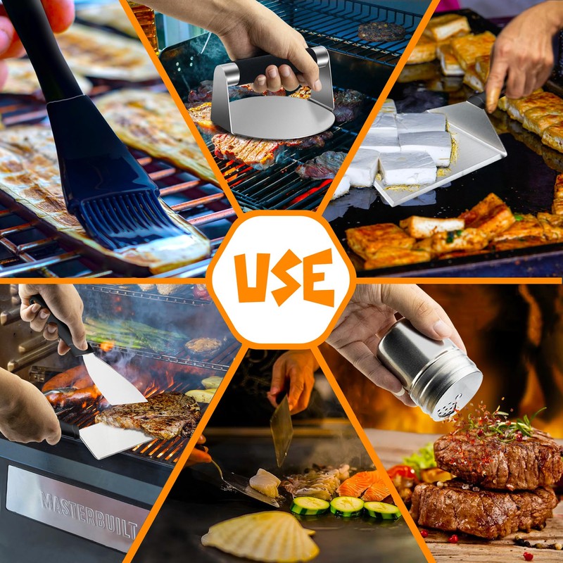 - Package includes: You will get Round burger press ,Silicone brush, large griddle spatula, Spice dredge shaker, 3pcs Hanging hooks. Thay are perfect for home cooking or outdoor barbecues. 3 steps to make delicious burgers!