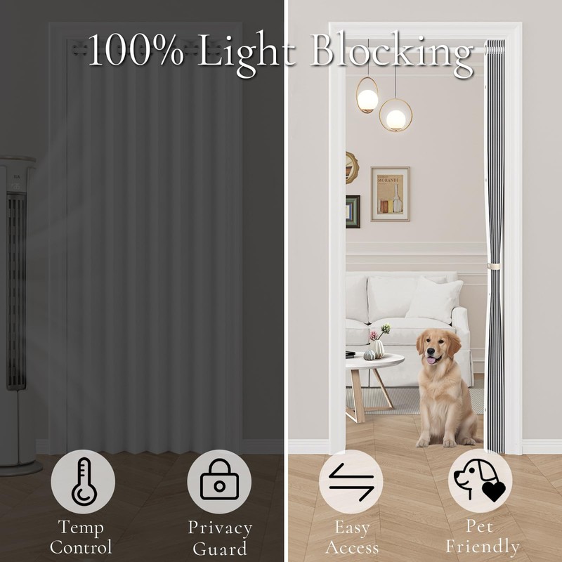 - Grommet Design: Tired of those shower-hook foding door curtain? You've found the right one! Our designers have pioneered a grommet design paired with 100% blackout faux linen fabric—sophisticated and far from cheap-looking
