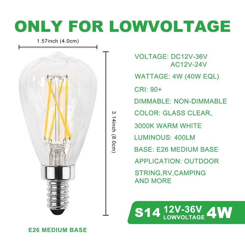 - 12 VOLT LIGHT BULB--12V low voltage light bulbs with E12 screw thread base, fit all types of E12 lighting fixtures, appropriate replacements for incandescent, halogen or fluorescent low voltage bulbs.