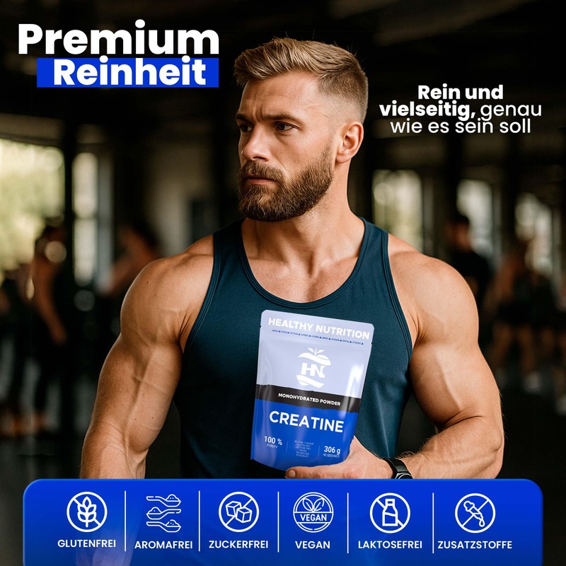 HN Creatine Monohydrate Powder 306 g (90 Servings), 10% Pure, Vegan Creatine Monohydrate, Gluten-Free, Lactose, No Additives, Neutral Flavour, IFS Certified