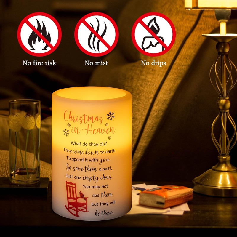 - Realistic Material: Bereavement gift candles are made of real wax. The surface of the sympathy candle is printed with clear memorial poetic words and chair. "Christmas in heaven what do they do......empty chair you may not see them but they will be there", Christmas memorial candles remind us that our loved ones are near. The perfect sympathy gift for loss of father, mother, grandfather, grandmother, son, daughter, brother, sister, etc.