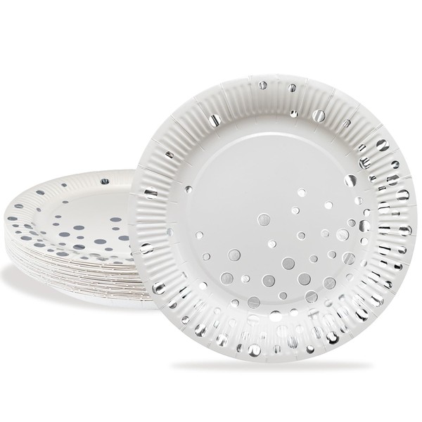HNH Party Paper Plates Set 24 Pieces White with Silver Foil Polka Dots 23cm Dinner Plates Set for Party Table Decorations