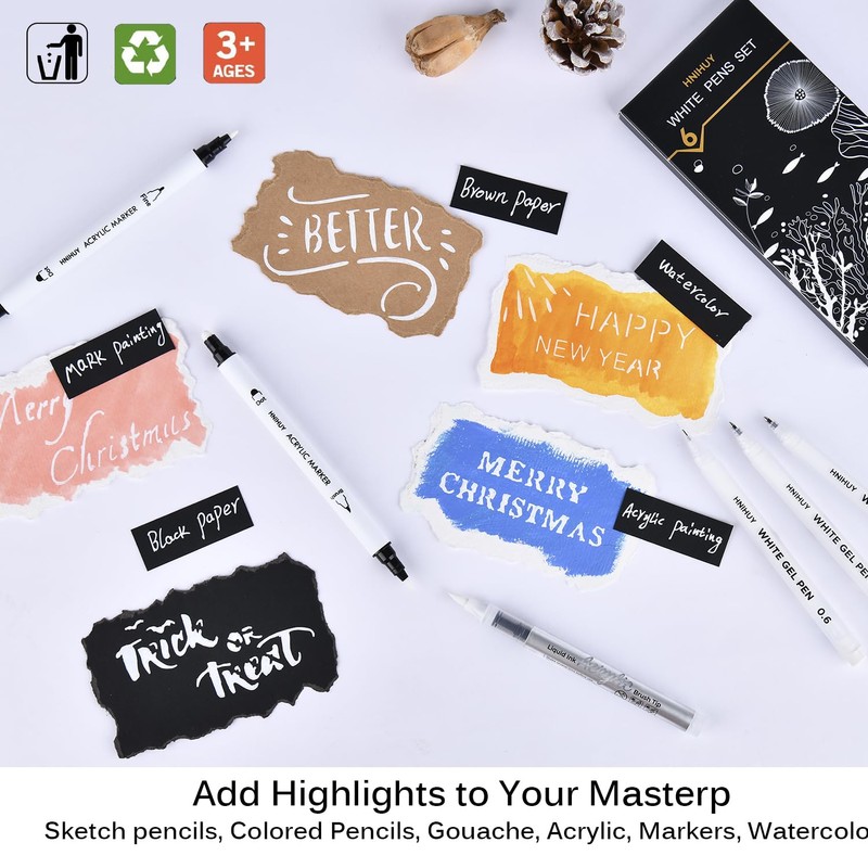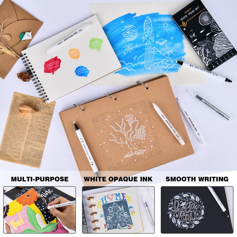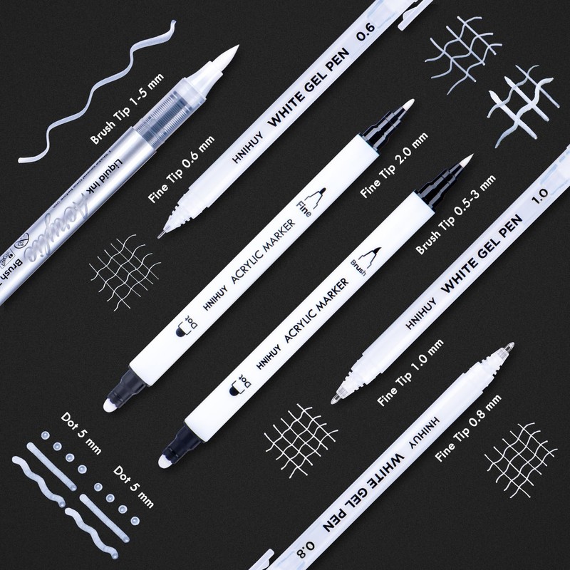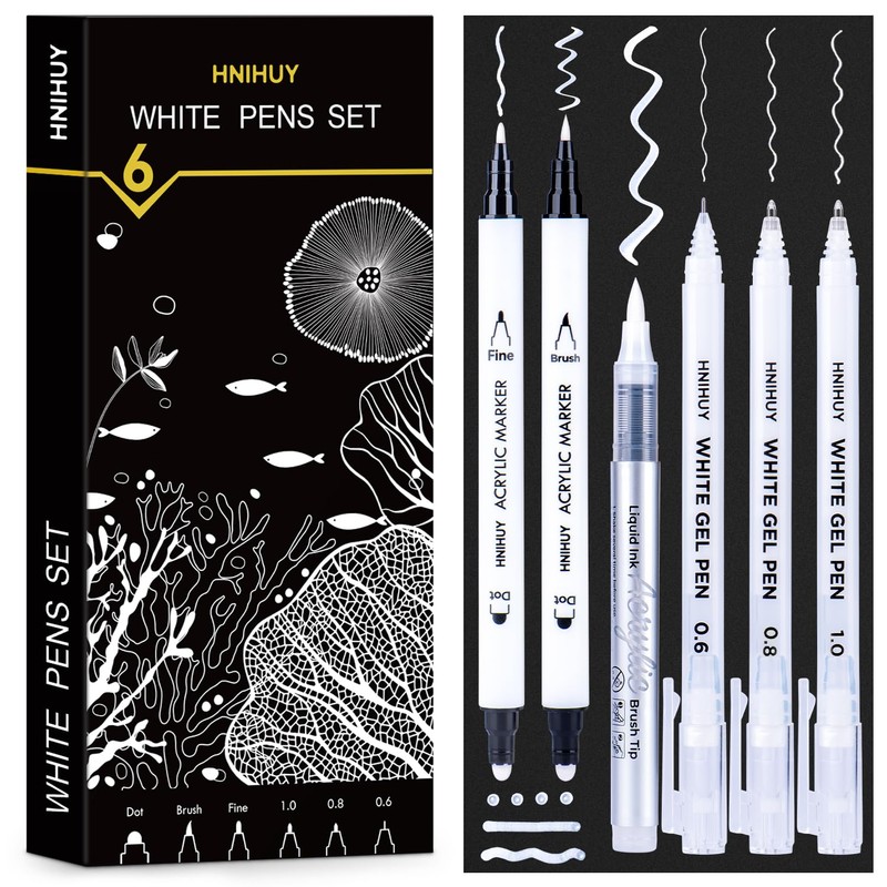 - WHITE OPAQUE INK PENS SET: White Pen set contains 6 white pens of 3 types: 3 White gel pens (1mm,0.8mm,0.6mm ),2 Dual-Tip White Acrylic Paint Pens(FineTip,Dot & Brush Tip), 1 Liquid Ink Acrylic Brush Tip