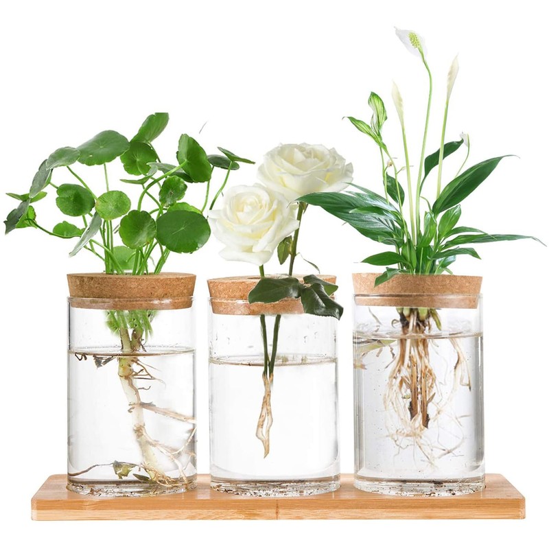 Hniuyun Propagation Stations, Desktop Plant Terrarium with Wooden Tray & Lid for Propagating Hydroponic Plants Centerpiece Office Home Decor, 3 Pcs